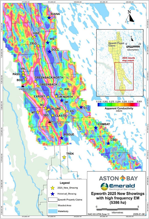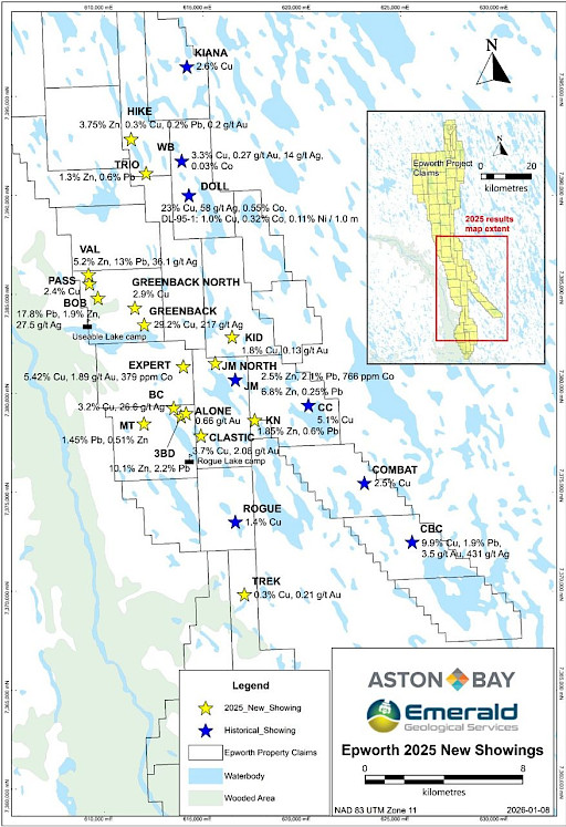 Aston Bay Holdings Ltd. (TSXV: BAY) (OTCQB: ATBHF) ("Aston Bay" or the "Company") is pleased to announce results from the 2025 summer field program at its Epworth sediment-hosted copper (“Cu”) – silver (“Ag”) - zinc (“Zn”) – cobalt (“Co”) - gold (“Au”) project (“Epworth” or the “Project”) located 80 kilometres (“km”) southeast of Kugluktuk in Nunavut, Canada.