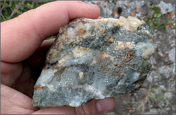 Figure 5: Dolomite-quartz veinlets with chalcopyrite at Pass Showing, up to 2.39% Cu.