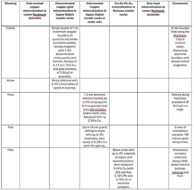 Many of the major new showings show good spatial correlation with both low- and high-frequency conductors. Expert, Alone, and Clastic are more marginal to the conductors, but their location is on the east margin of a syncline that dips towards the conductors. Most showings also occur along or proximal to the Rocknest-Odjick contact, as has been observed elsewhere on the Property.