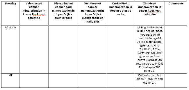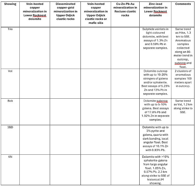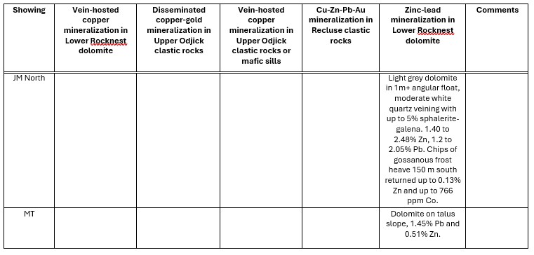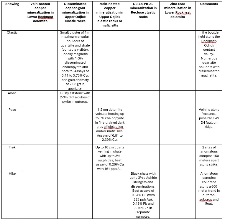 The showings, sampled from outcropping, subcropping (broken but deemed in place) rock and local boulders, are described in Table 1 and categorized by the styles of mineralization present. Of 309 select grab samples, 22 yielded ≥1% Cu, 22 samples yielded > 5 g/t Ag, 16 samples yielded >1% Zn, and 7 samples yielded >0.5 g/t Au. See Figure 1 for location and select grab sample results for each showing. Follow this link for copper, zinc, silver, gold, cobalt and lead results mapped thematically.