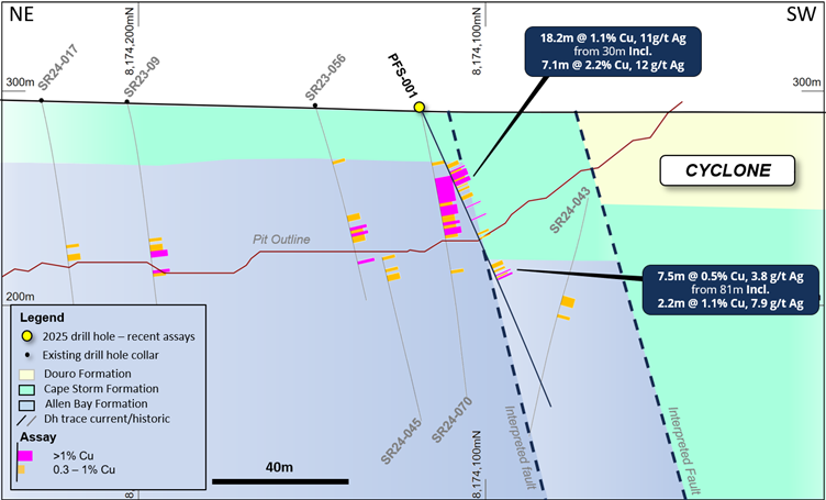 The copper mineralization in PFS-002 is located approximately 70m to the north of the current pit design. Follow-up drilling further to the north-east also intersected mineralization within the same horizon (9.1m @ 0.6% Cu, 3.7g/t Ag in SR25-017 – Figure 5). The mineralized horizon remains open to the north and along the entire northern margin of the deposit, highlighting the growth potential of the existing resource.