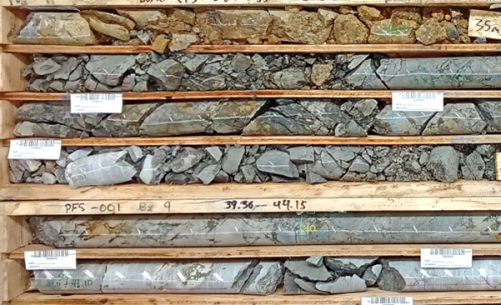 Figure 3: Dense breccia and semi-massive visual chalcocite (dark grey mineral) in drill hole PFS-001 (33.4-40.5m downhole). This interval assayed at an average grade of 2.2% Cu, 12g/t Ag.