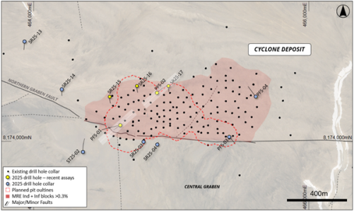 Assay results from the first two geotechnical/resource diamond drill holes at the Cyclone Deposit have been received and highlight the resource upgrade and expansion potential of the current proposed open pit design.