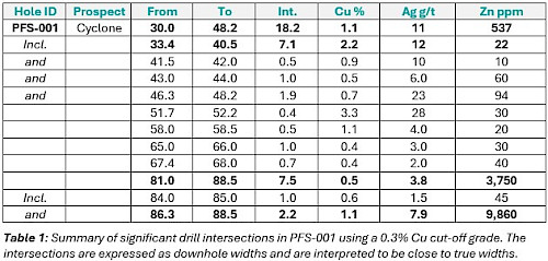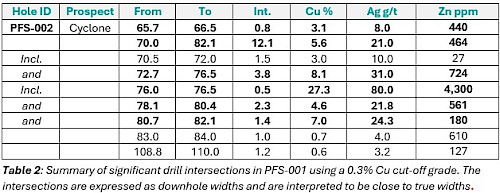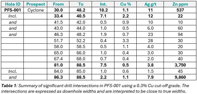 The drill hole is interpreted to have intersected one of a series of faults that bound the central graben to the north and offset the stratigraphy downward to the south. Two styles of mineralization are present within PFS-001: stratabound at a depth of approximately 83m and intermittent fault-hosted at a downhole depth of 92m. The copper sulphide mineralization is hosted within a thick sequence of fractured and brecciated dolomudstones of the Allen Bay Formation.