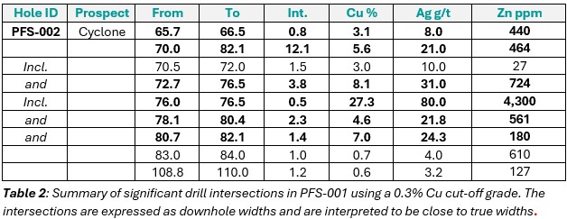 PFS-002 was drilled to a depth of 176m on the northern margin of the Cyclone Deposit (Figures 5, 6 & 7).