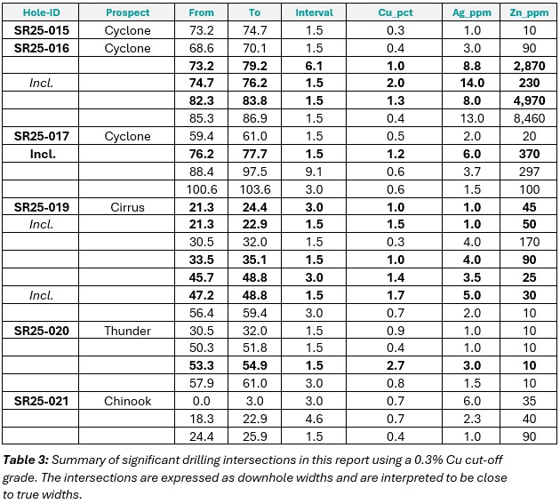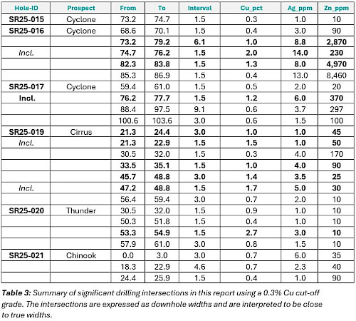 Reverse Circulation (RC) drilling results support resource upgrade and expansion: Assays from the resource drilling around and within the Cyclone, Chinook, Thunder, and Cirrus Deposits continue to intersect thick copper intervals with positive implications for resource expansion at Storm.