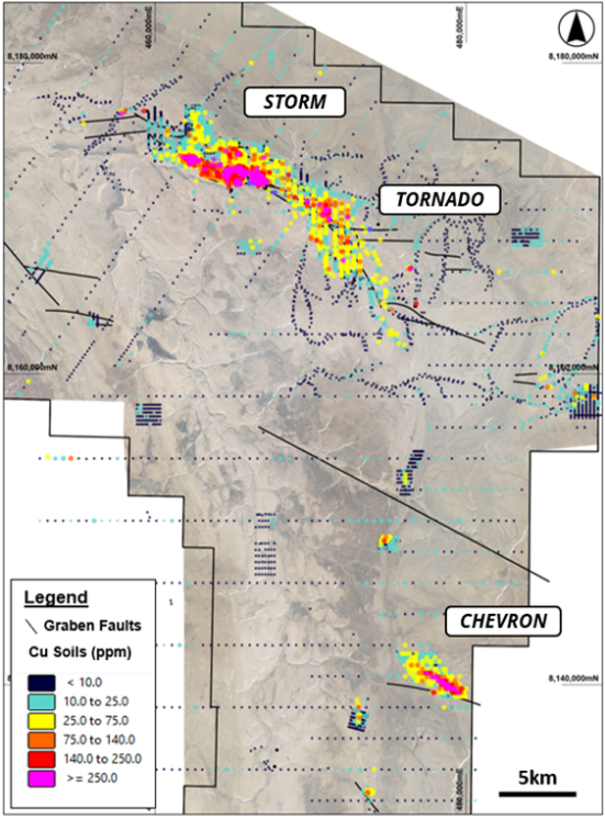 - High-priority target: The geological features of the Chevron Prospect are similar to those that host the known copper deposits in the Storm area – including a similar geochemical signature and structural trend – making Chevron a compelling target for a major new copper discovery.