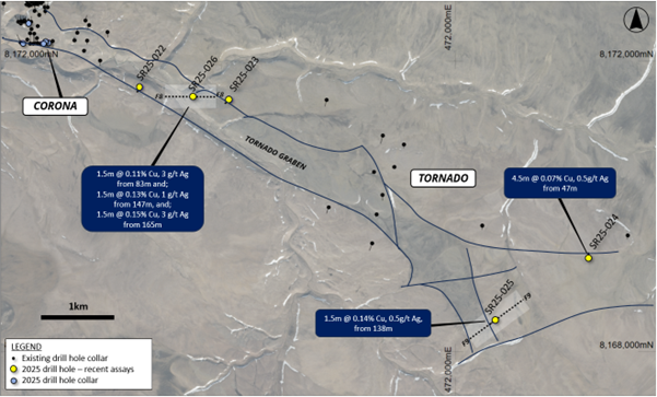 - Squall high-grade copper zone expanded: Assays confirm further high-grade copper sulphides at the Squall Prospect, which show a similar setting and style of mineralization to the Corona Copper Deposit, 1.3Km to the east, including drill hole SR25-012, which intersected: