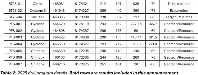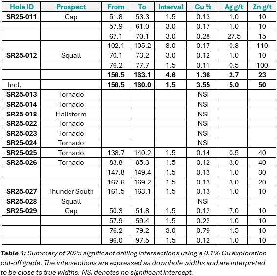 Drill holes SR25-013 and SR25-014 were completed to the far west of Cyclone and were designed to test conceptual targets and gather stratigraphic information. These drill holes did not encounter any significant copper sulphide mineralization.