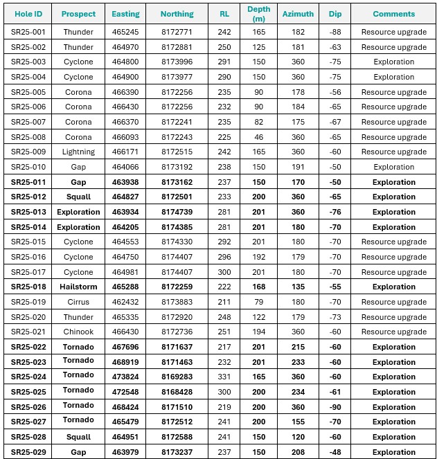 Drill holes SR25-011 and SR25-029 were aimed at extending the known mineralization at The Gap prospect, where previous drilling had intersected (8m @ 5.3% Cu in drill hole SR24-03).